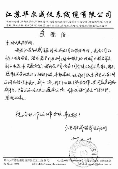 江蘇華爾威儀表線纜有限公司08年在網絡推廣方面取得了斐然的成績,網絡推廣給公司的銷售帶來新的機遇和發展前景。公司在網絡推廣中的突出表現得益于中國儀表展覽網的大力支持和周到服務,特致信對中國儀表展覽網的技術實力和行業實力表示了充分的肯定,對相關工作人員予以衷心的感謝,并對09年的合作和前景充滿了信心。
